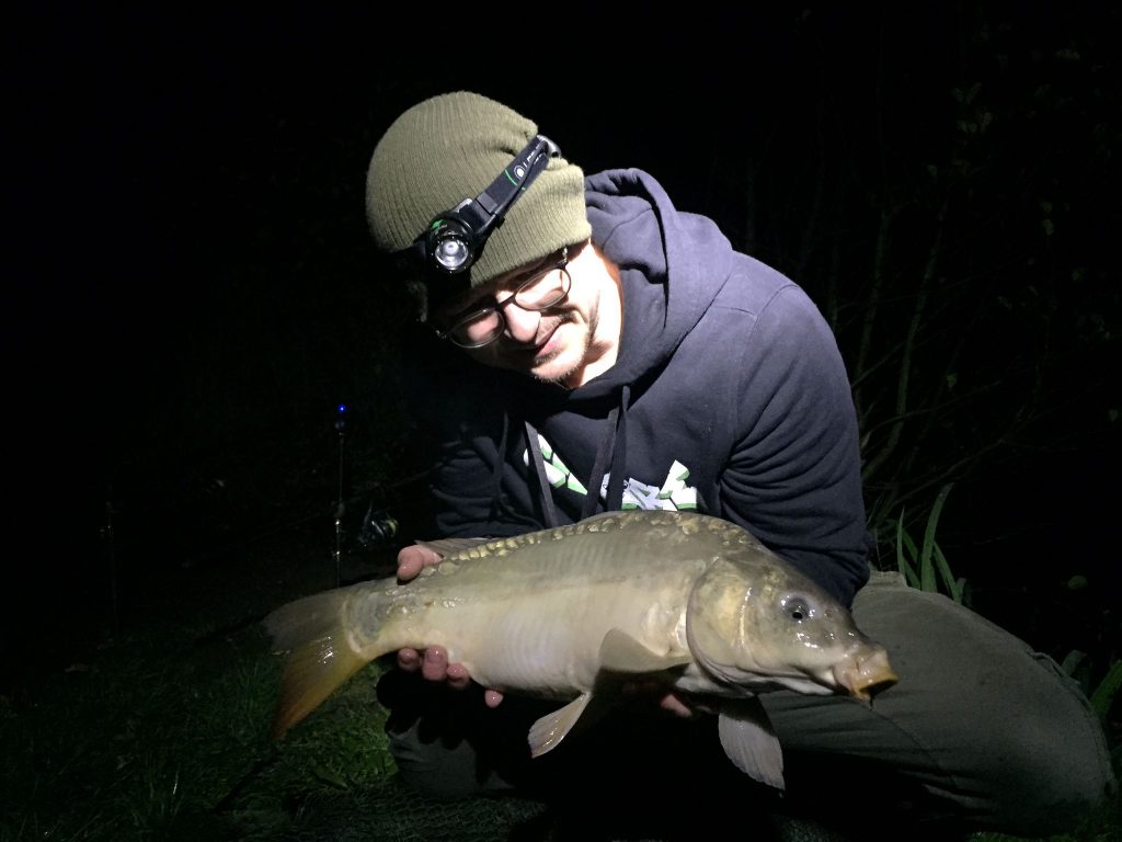 Es ist kalt geworden, mittlerweile 19.30 Uhr, und man macht sich schon Sorgen um die Pizza. Mein Handy klingelt und natürlich findet er uns nicht auf Anhieb. Er fragt ob wir ihm entgegenlaufen können, aber das geht nicht, da er von der ganz anderen Seite kommt, und wir um den ganzen Weiher laufen müssten. Nett bitte ich Ihn immer weiter zu fahren, und auf unsere Kopflampen zu achten. Endlich erscheint er aus dem Wald, und wir können die wirklich noch heißen Pizzen entgegennehmen. Natürlich gibt’s gutes Trinkgeld. Direkt verkriechen wir uns in Marians Bus zum Essen, in dem die Standheizung schon gute Vorarbeit geleistet hat. Ich habe gerade 4 Stücke Pizza verdrückt, und etwas Salat genossen, da geht mein Funkempfänger los… Die anderen folgen mir, sehn tut man nicht viel, denn es ist stockdunkel, und Nebel macht sich breit. Der Fisch wird gelandet und fotografiert, auch wenn es sich nicht um einen Herbstbullen handelt, sondern eher das komplette Gegenteil, aber Fisch ist Fisch. Schnell wieder in den Bus und weiter schlemmen.