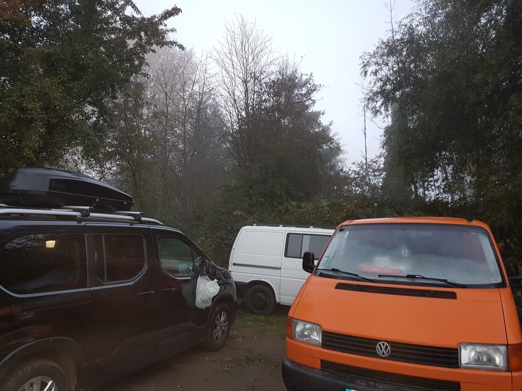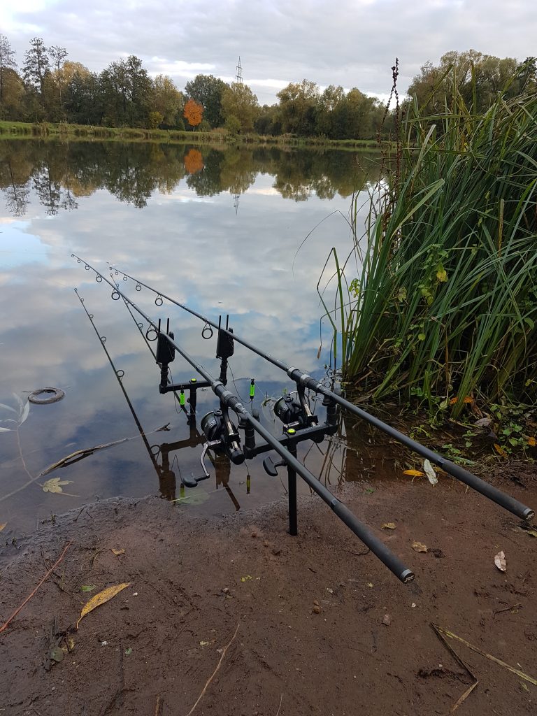 Samstag, 23.10.2021, und ab zum Privatgewässer… Es ist 12.10 Uhr als ich den holprigen Weg durch den Wald hinter mich gebracht habe, und langsam rückwärts auf unseren Angelplatz zurolle. Christian parkt schon mit seinem orangenen Bus und lotst mich ein. Eigentlich haben wir zwei viel Platz für uns allein, aber warum muss ich bis ins Kleinste genau einparken?! Die Antwort kommt prompt beim Aussteigen und Abklatschen: „Heute erwarten wir noch einen Star-Gast!“ Ja, und da war es mir klar… Marian wird auch mal wieder kommen. Er hat sich zumindest für dieses Wochenende vom Lernen und Arbeiten losgesagt. Prima!