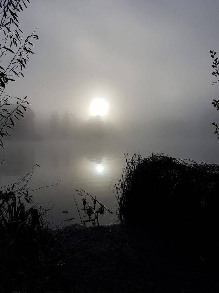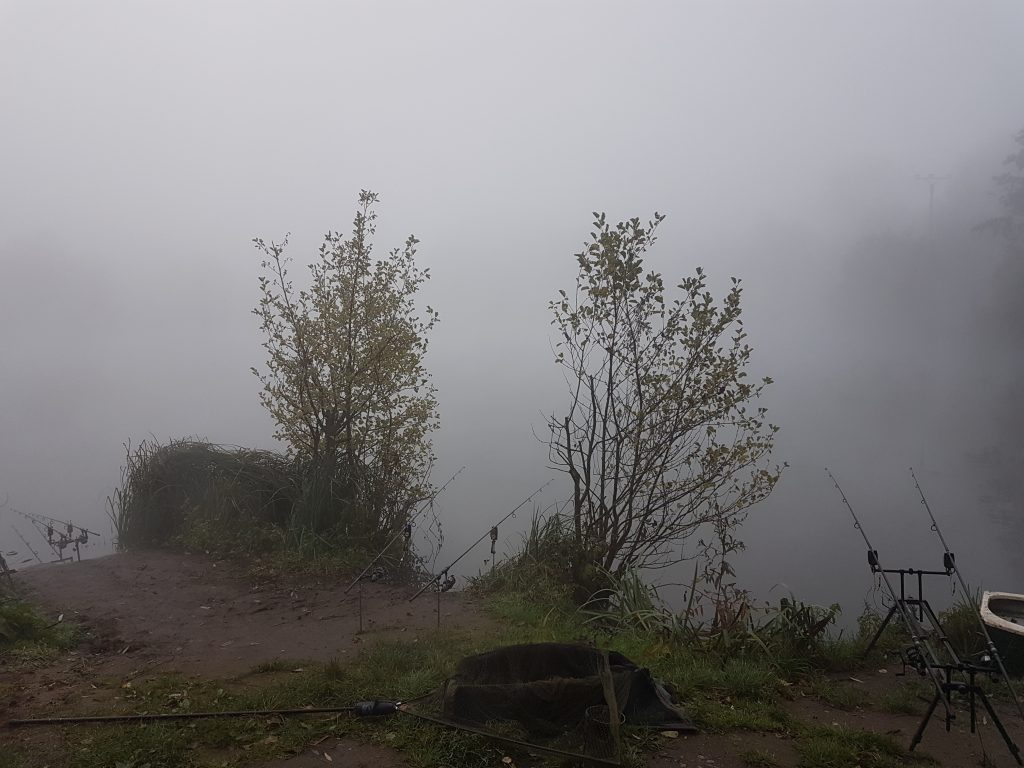 Morgens bin ich wie immer zuerst wach, und es sind zarte 4 Grad. Der Weiher ist komplett in dichten Nebel gehüllt. Ein paar Schnappschüsse, und der erste Cappuccino wird aufgegossen. Um 8 Uhr schaut dann auch mal Christian aus dem Bus, und kurz darauf erschreckt Marian, als ich mal durch sein Busfenster schaue. Nach einer erneuten Runde Cappuccino fange ich langsam an einzupacken, die Jungs schließen sich an. Christian muss tatsächlich noch ins Boot, da seine Montage, auf welche die ganze Nacht gar nichts ging, festhängt. Nach kurzem Manöver kann er sie von einer alten Angelschnur lösen, welche im Wasser hinterlassen wurde, vermutlich jedoch nicht aus Absicht.