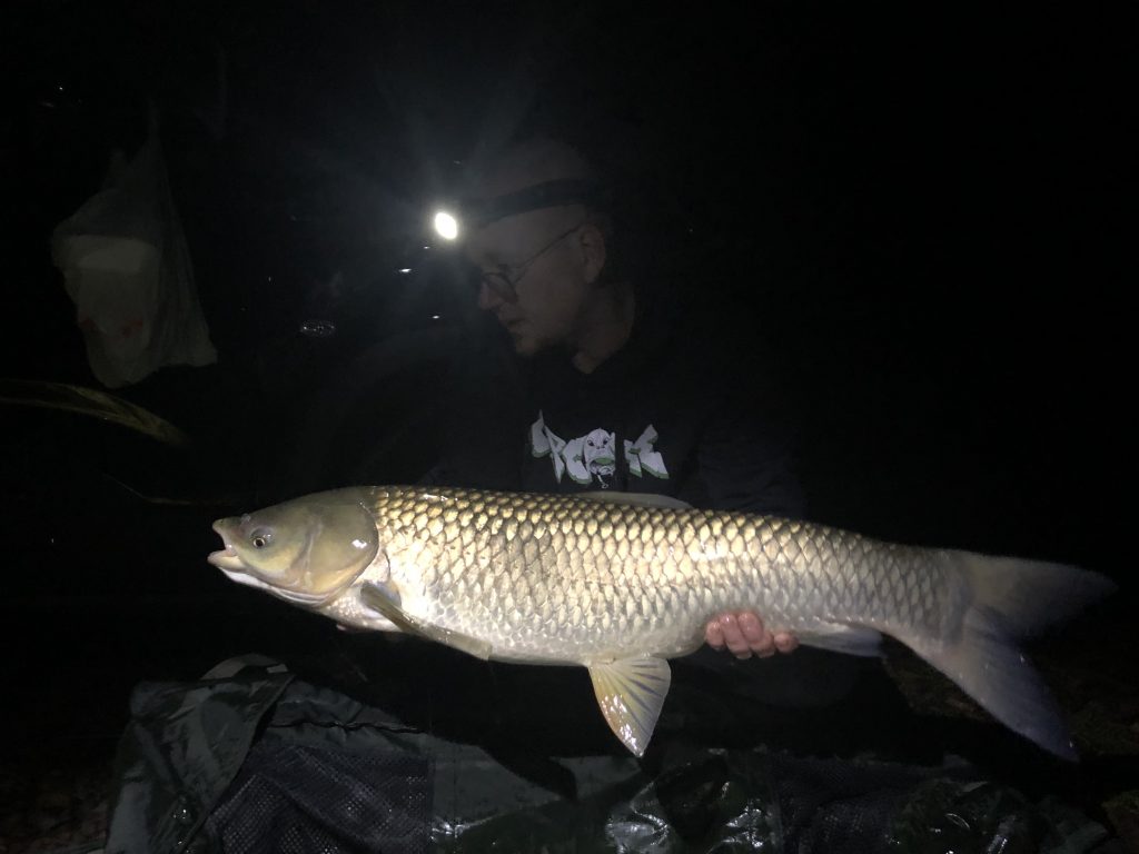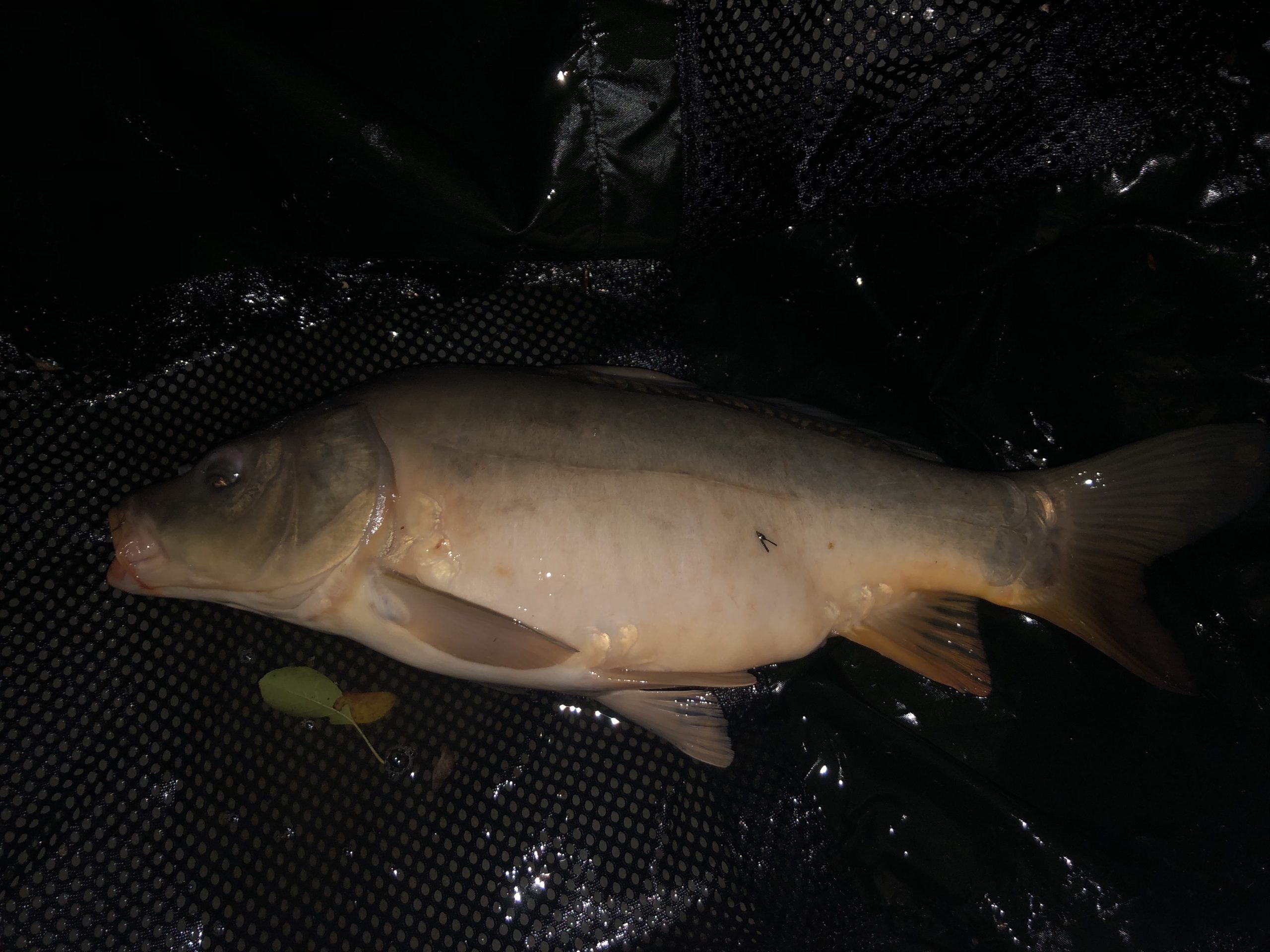20 Uhr und endlich wieder Pizza vom Lieferanten unseres Vertrauens, herrlich! Mittlerweile ist es dunkel, die Bäuche sind voll und das Bier bzw. der Rotwein munden. 22 Uhr ist Schlafenszeit und jeder zieht sich in sein Auto zurück. Die Heizungen laufen und der Regen hat eingesetzt. Herrlich das Geräusch wenn der Regen auf das Dach prasselt. Um 24 Uhr ist es dann bei mir soweit… Im Tiefschlaf beginnt der Bissanzeiger zu schreien und ich taumele verschlafen zur Rute. Mein Gegner leistet keine große Gegenwehr und so werde ich Ihn wohl alleine landen können. Falsch gedacht, denn kurz vorm Ufer beginnt er sich zu wehren und so bin ich heil froh, dass Marian hinter seinem Bus erscheint um mir zu helfen. Das Problem ist nämlich, dass der Weiher einen sehr niedrigen Wasserstand aufweist und die Uferkannte steil abfällt. Gemeinsam schaffen wir es aber, und so liegt wenig später ein prächtiger Torpedo (ca. 6-8 kg) auf meiner Abhakmatte. Nach ein paar Schnappschüssen geht’s wieder zurück ins Auto, die Rute lasse draußen, da ich tatsächlich Schlaf benötige.