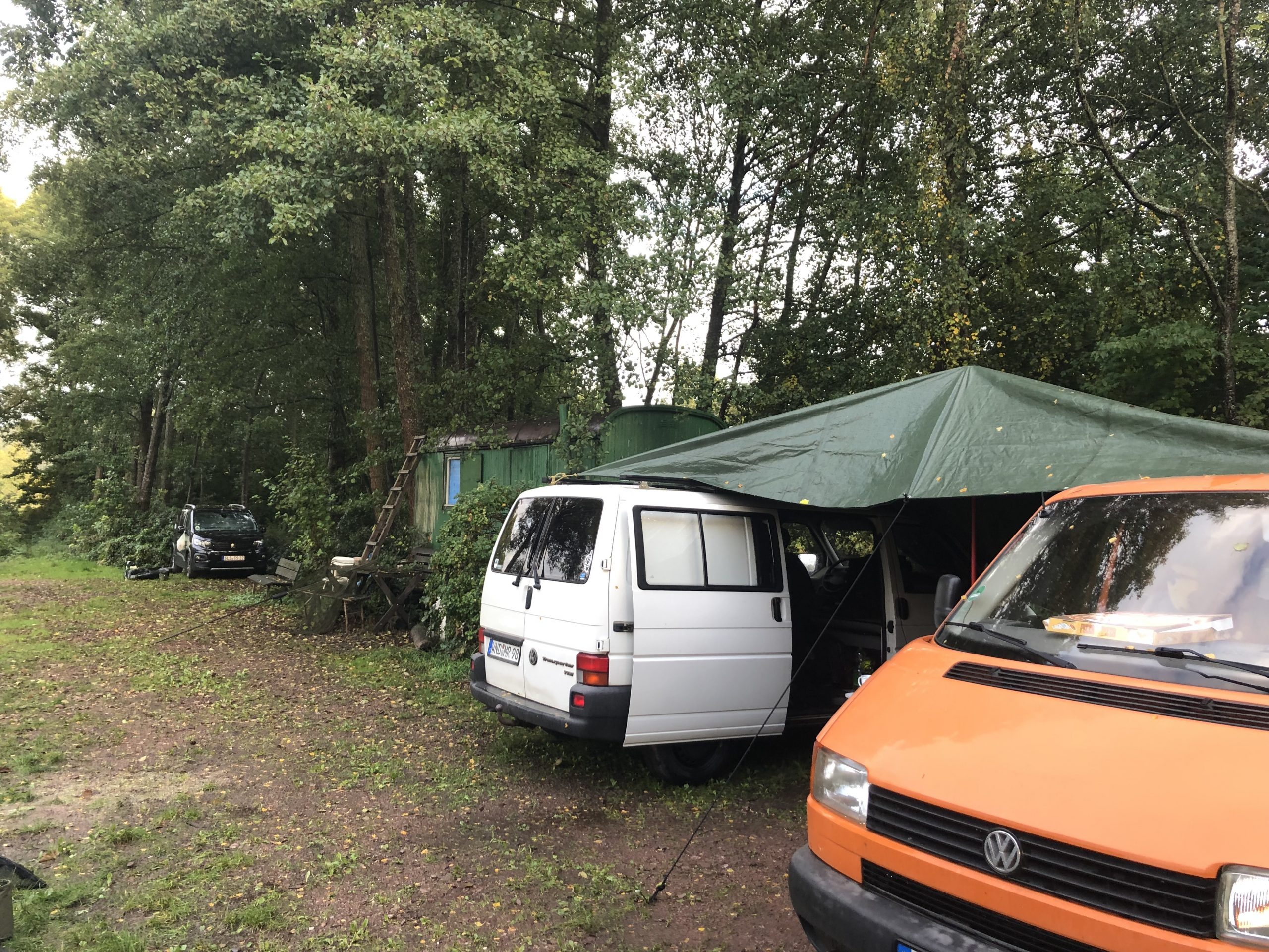 Da für die Nacht und eigentlich das ganze Wochenende Regen angekündigt ist richten wir die Busse direkt richtig aus und spannen die Regenplane, damit wir bei Wind und Wetter gemütlich zusammensitzen können. 18.30 Uhr können wir das Boot ins Wasser lassen und nacheinander unsere Ruten ausfahren. Stellen müssen nicht gesucht werden, da wir das Gewässer ja bestens kennen. Christian sahnt nach kurzer Zeit bereits den ersten Fisch ab, was uns sehr hoffnungsvoll auf das Wochenende blicken lässt.