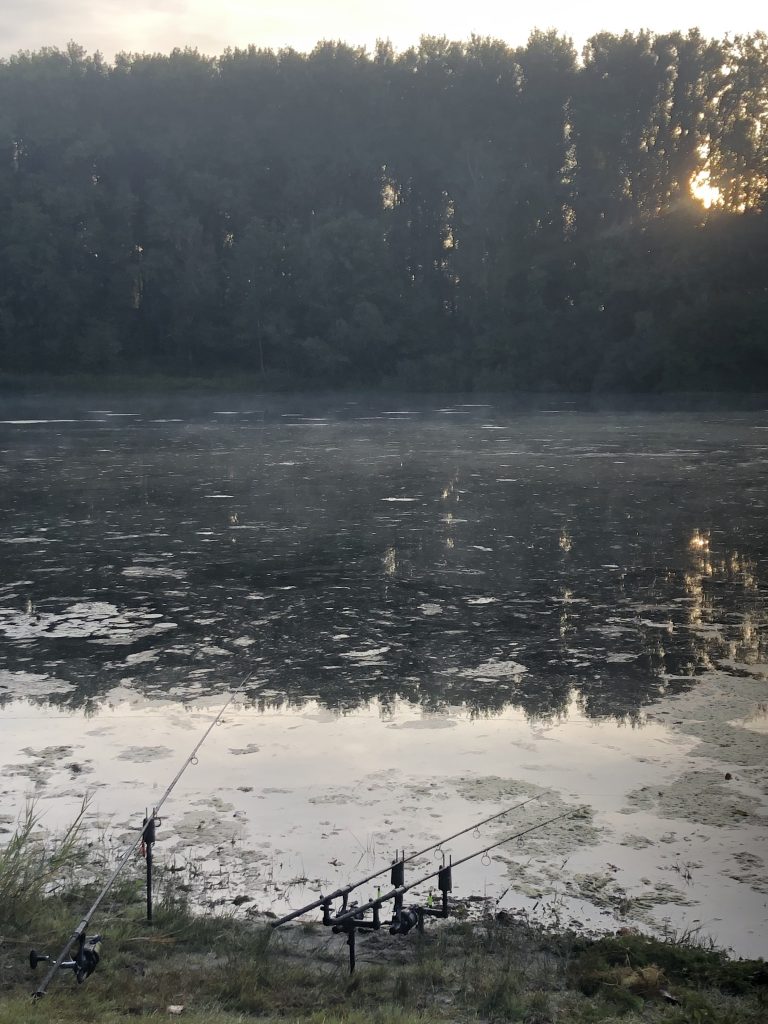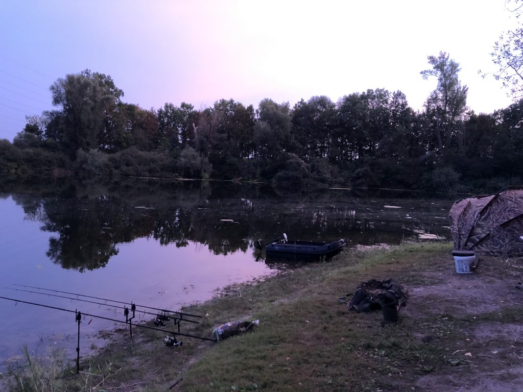 Erst wird das Camp aufgebaut und die Ruten bestückt. Als alles fertig ist machen wir eine kleine Erkundungstour mit dem Boot. Der Sommer hat ganze Arbeit geleistet und unendlich viel Kraut im Wasser wachsen lassen. Abnormal! Ich entscheide mich, wie beim letzten mal, für die linke Weiherseite, Christian nimmt die Rechte. Ich lege meine Ruten auf Sichtweite im Uferbereich ab, eben da wo krautfreie Lücken zu finden sind, Christian geht in die tieferen Bereiche, was sich als richtig erweisen wird.