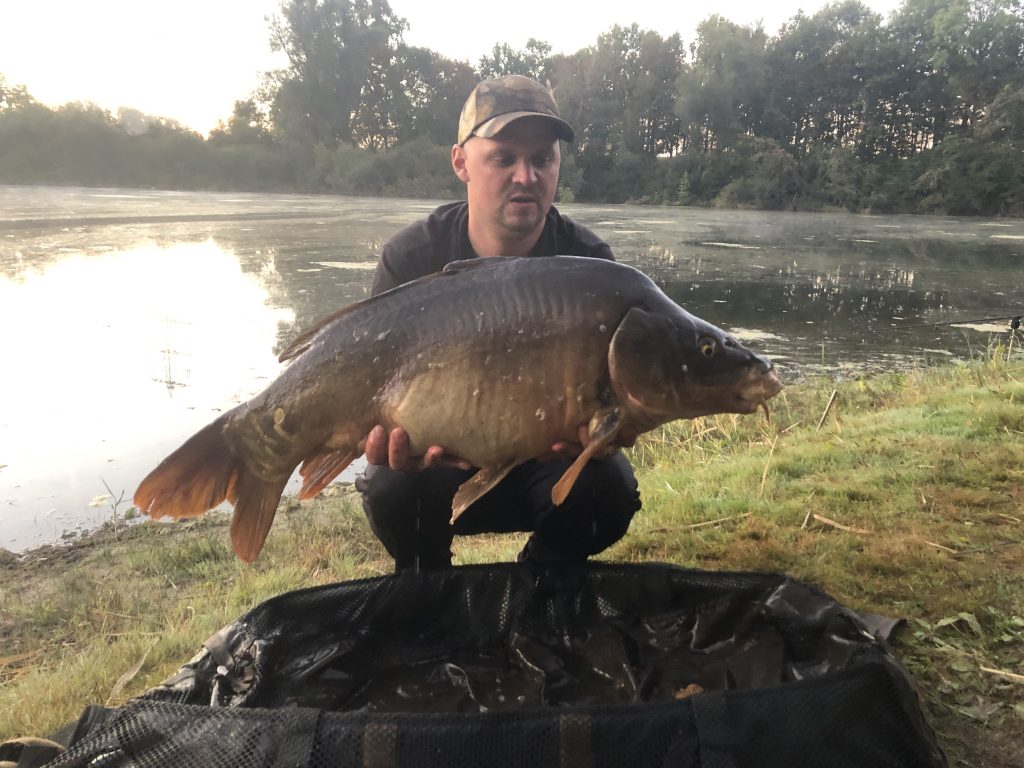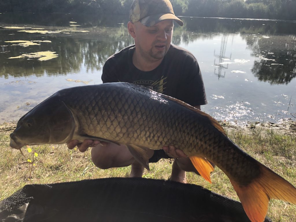Die Nacht bleibt leider ohne Fischkontakt, aber um 6 Uhr pfeift Christians Rute ab. Ich springe aus dem Zelt und wie es aussieht muss ich den Fisch vom Boot aus keschern, da das Kraut einen Drill bis ans Ufer nicht zulässt. Als ich auf dem Wasser bin pfeift tatsächlich seine Zweite Rute ab. Doppelrun! Nun ist guter Rat teuer. Christian bleibt beim aktuellen Drill und lässt die andere Rute einfach liegen. Nachdem ich den ersten Fisch endlich im Kescher habe und neben dem Boot im Wasser parke, nimmt Christian die andere Rute auf. Der Fisch hängt noch und lässt sich tatsächlich bis ans Ufer kurbeln. Zwei wunderschöne Spiegler können wir im Anschluss ablichten, einer mit 15kg, der andere mit 11kg. Petri!