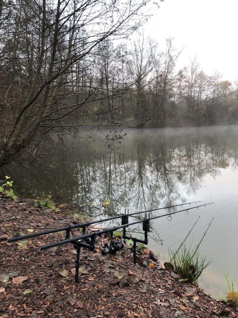 17 Uhr treffe ich bei Sonnenuntergang am Platz ein, Marian und Christian warten bereits. Ich bin aufgeregt, denn Ende September/Anfang Oktober war es für mich wieder eine Nullnummer, und an diesen 3 Tagen möchte ich nicht wieder ohne Fisch nach Hause gehen. Die Kopflampen können wir sofort auspacken, und das Ausfahren der Ruten geschieht bei völliger Dunkelheit. Aber erst mal Autos einrichten, Plätze aufbauen, Ruten bestücken und das Boot ins Wasser lassen. Um 18 Uhr sind wir startklar und können mit dem Ausfahren beginnen. Ich liege am Angelplatz 2 diesmal auf der linken Seite, Marian in der Mitte und Christian rechts außen im Freiwasser. Die Stellen sind schnell gefunden da wir das Gewässer gut kennen. Gegen 19 Uhr sitzen wir alle bei Kerzenschein auf unseren Stühlen, und freuen uns über die von mir mitgebrachten Wärmesohlen, denn dieses Wochende wird bereits die 0 Grad-Marke geknackt werden. Man hat sich viel zu erzählen, da man sich lange nicht gesehen hat, und Marian kann währenddessen schon den ersten Karpfen verhaften. Das macht Hoffnung, und um 19.30 wird 3x Pizza + 3x Beilagensalat geordert. Um 20.30 Uhr wird sich in Marians warmen Bus verzogen, lecker gespeist, und noch das ein oder andere Bierchen vernascht. Lange halten wir aber nicht durch, und um 21.30 Uhr geht’s ab zum Schlafen.