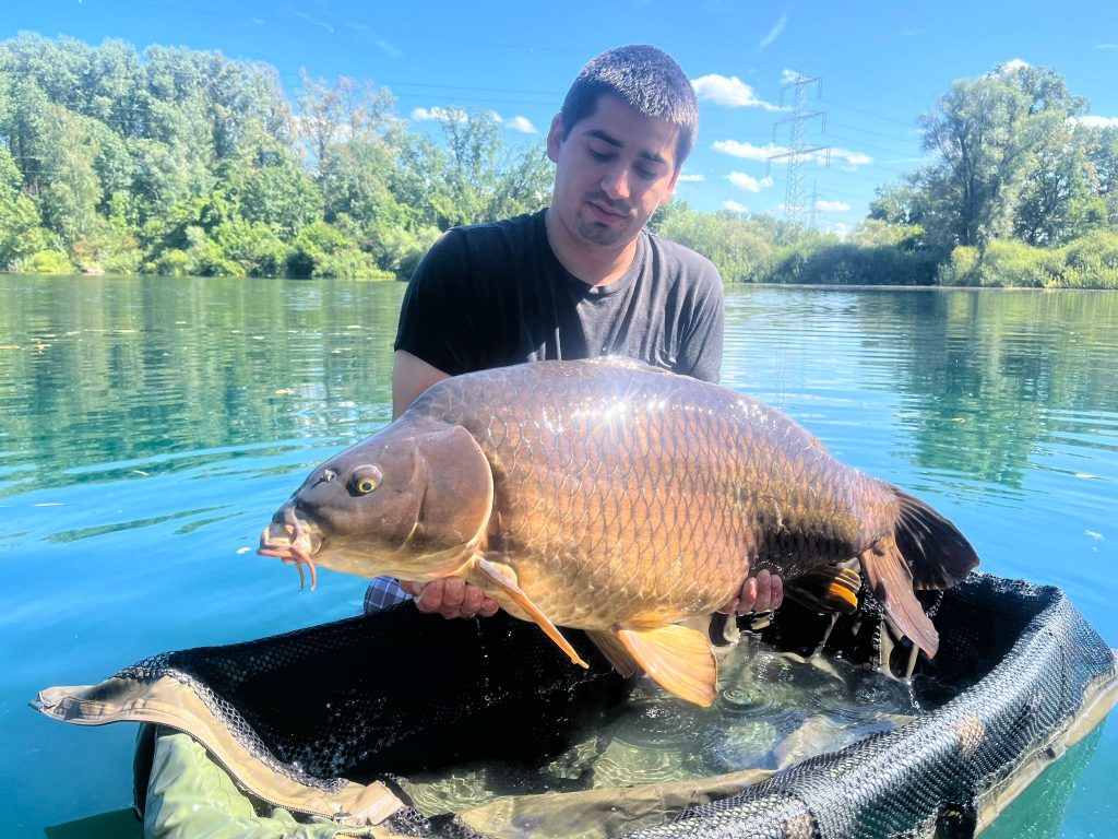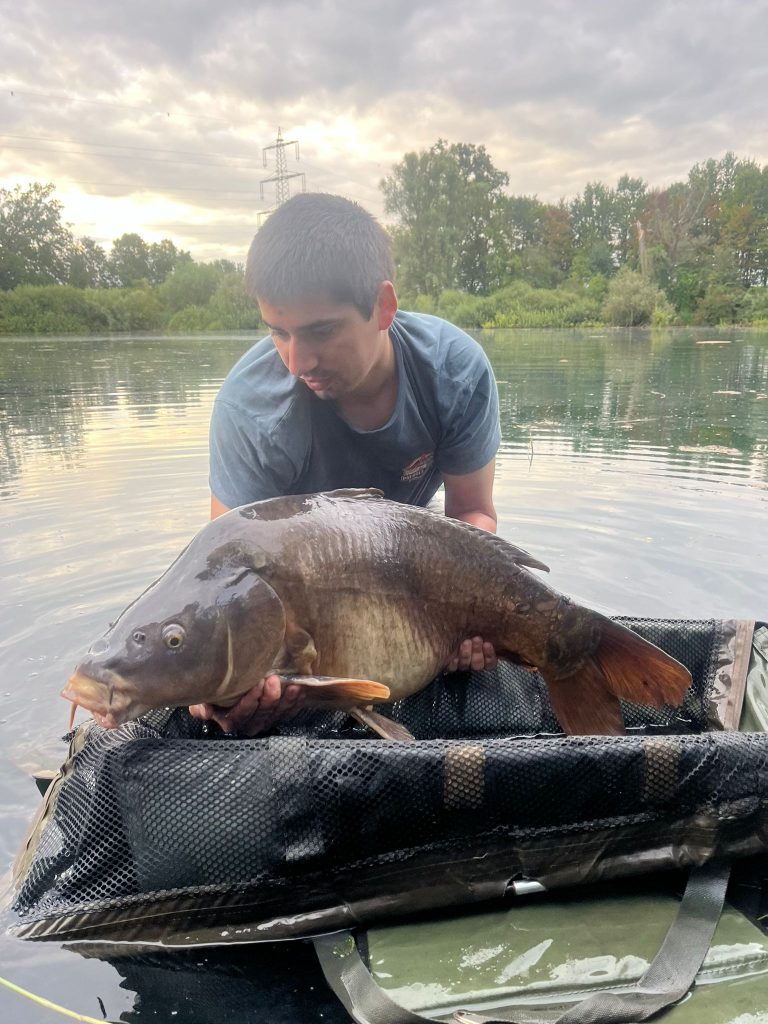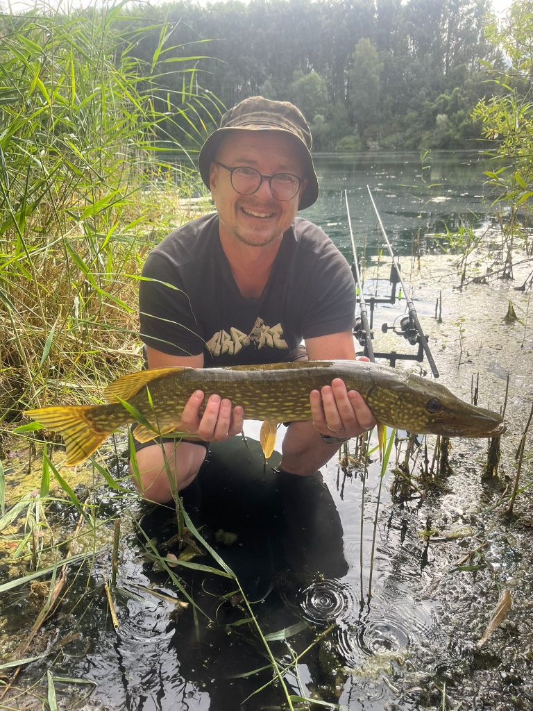 Morgens um 8 Uhr verhaftet Marian noch einen schönen 13 kg Spiegler, welcher sich mit aller Kraft wehrt um sich vernünftig ablichten zu lassen. Nach dem Frühstück fangen wir schon langsam an einzupacken, und schmieden Pläne wann wir im nächsten Frühjahr 2025 den Weiher wieder besuchen werden. Christian und ich hoffen jeweils noch auf den zweiten Fisch, aber um 10 Uhr werden die Ruten eingeholt. Dabei staune ich nicht schlecht als ich einen Hecht einkurbele… Zwar nicht mein Zielfisch, aber trotzdem geil.