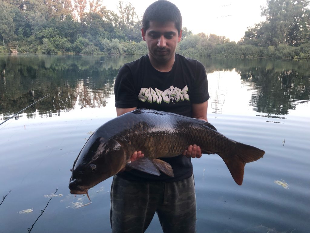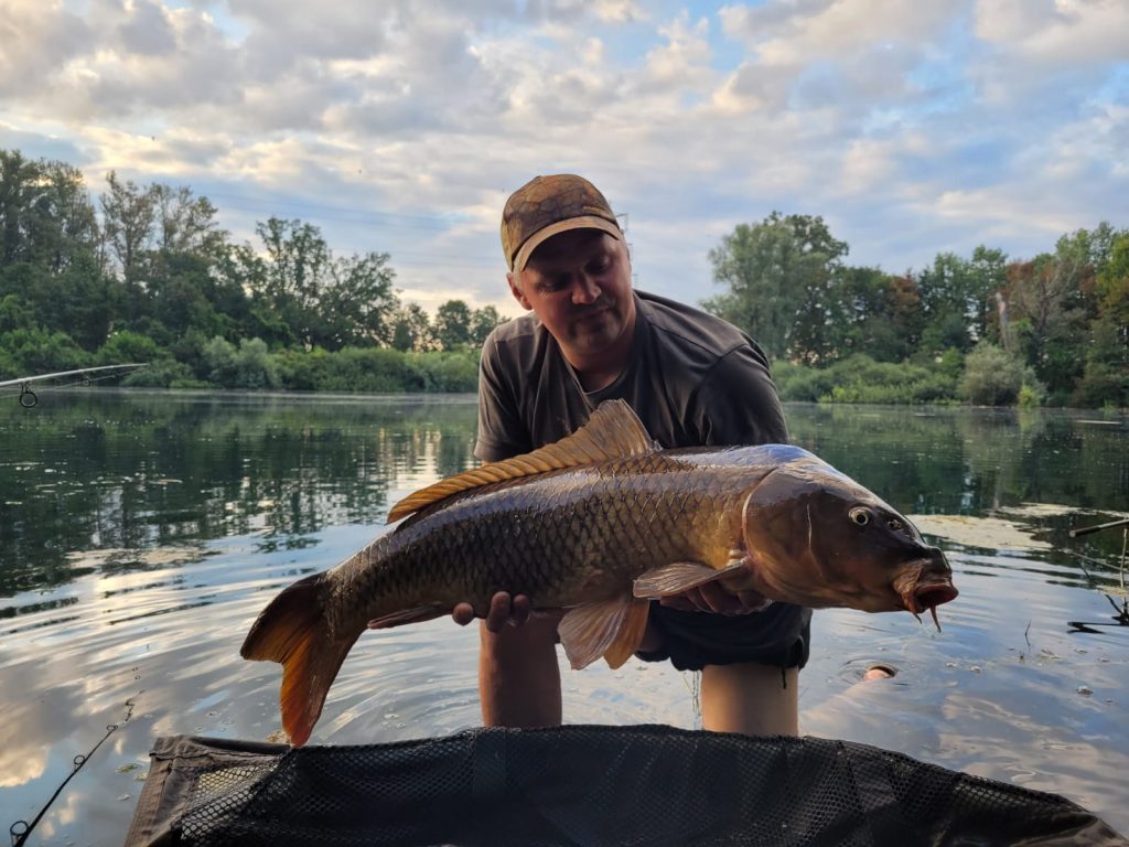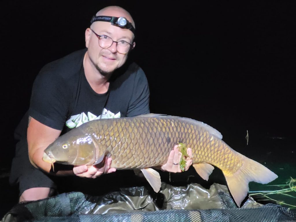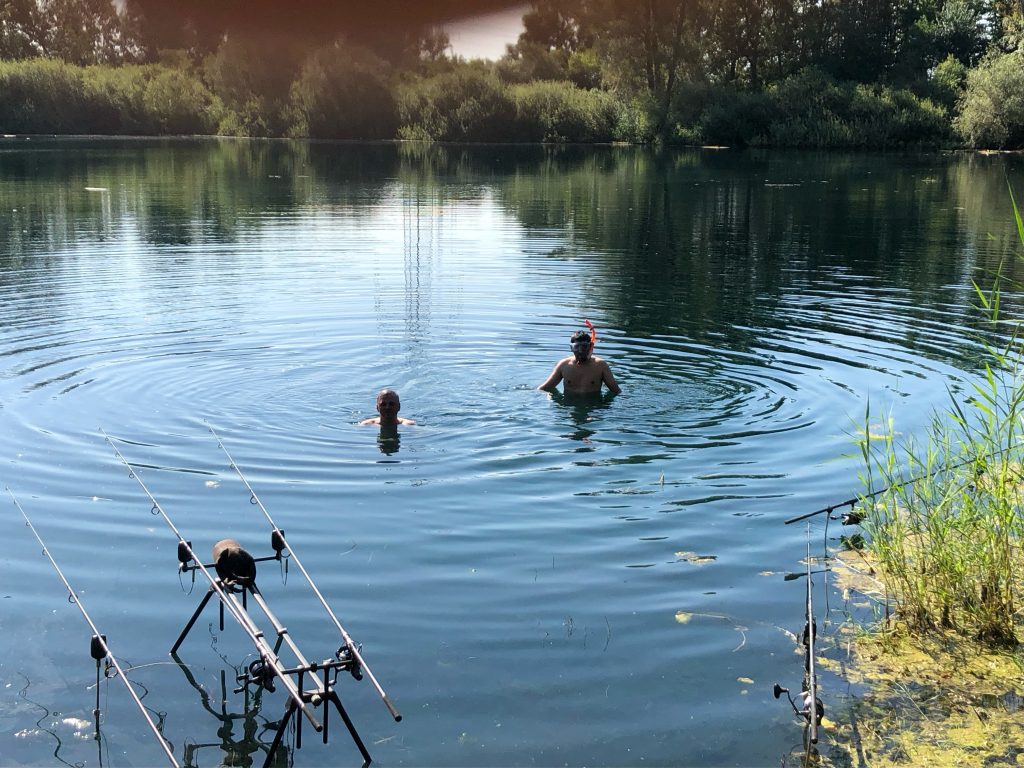 Um 13.30 Uhr sind alle Ruten platziert und es darf gekocht werden. Platz finden wir zwischen den schattigen Bäumen, und es ist geplant unter freiem Himmel auf den Liegen zu schlafen. Der Mittag verläuft ganz chillig mit Radio Classic Rock, guten Gesprächen und einem kleinen Schwimmchen im Weiher. Gegen Abend steht Grillen auf dem Plan und die Holzkohle nimmt schon richtig Fahrt auf, als völlig überraschend Marians Rute gegen 20 Uhr abläuft. Die Fische kämpfen hier nicht schlecht und haben richtig Power, aber wenig später hält er stolz einen ca. 8 kg Schuppi in den Händen. Das macht Hoffnung und wir lassen uns das Grillgut wenig später schmecken. Neben dem Fisch kommen in der Abenddämmerung aber auch die Stechmücken, und wir bewaffnen uns mit Autan und Räucherstäbchen. Dennoch müssen wir zahllose Stiche ertragen und es juckt am ganzen Körper. Na das kann ja heiter werden… Gegen 22 Uhr legen wir uns auf die Liegen, und es ist wunderschön den Sternenhimmel direkt anzuschauen, aber ständig hört man dieses fiese Geräusch wenn sich die Stechmücken nähern. Ich packe mich in den Schlafsack bei über 20 Grad Außentemperatur, aber leider habe ich nur den Winterschlafsack im Gepäck, mit der Folge dass ich die ganze Nacht über schwitze wie ein Schwein! Um 2 Uhr pfeift meine Rute ab und ich hechte ins Wasser zu meiner Rute. Nach Kontaktaufnahme und einem kurzen Drill bewegt sich aber nichts mehr, und die Jungs fahren mit dem Boot raus da der Fisch im Kraut hängt. Als Sie zurück kommen haben Sie aber eine Überraschung für mich in der Wiegeschlinge! Einen wunderschönen 10 kg Schuppi, den Sie mit meiner Montage aus dem Kraut befreien können. Überglücklich und voller Adrenalin versuche ich wieder einzuschlafen.