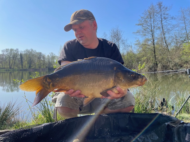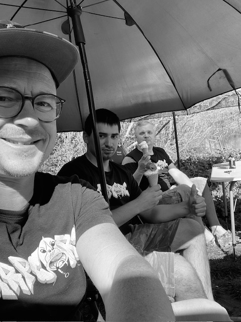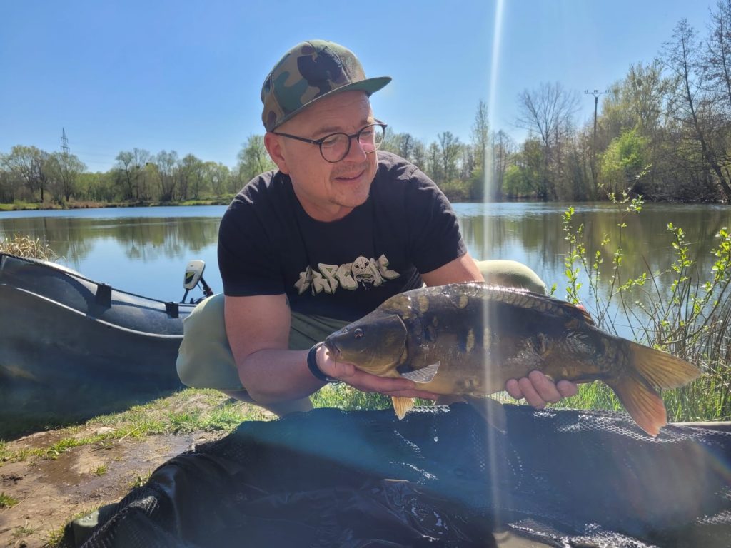 Ab 18 Uhr wird die Pizzakarte studiert und diskutiert, gechillt auf den Stühlen gesessen und Bierchen geschlabbert. Gegen 19 Uhr wird bestellt und eine Stunde später endlich gespeist. Schön dass endlich der Frühling winkt, denn wir können unseren Pizzamann endlich mal wieder im Hellen ohne Kopflampe empfangen. Gegen 22 Uhr wird Radio Rockantenne abgeschaltet, und es geht in die Busse mit voller Vorfreude auf den morgigen Samstag, welcher bis zu 22 Grad verspricht. Die Nacht ist aber noch recht kalt, doch als ich am nächsten Morgen wach werde spürt man schon die Wärme und Kraft der aufgehenden Sonne. Bei Käffchen und kalter Pizza wird die ruhige Nacht diskutiert… Neben ein paar Piepsern hat nur Marian einen Satzer fangen können, welchen er jedoch direkt am Ufer wieder abhakt und in die Freiheit entlässt. Rockantenne wird angeschaltet und der lange sonnige Samstag kann beginnen. Das seitliche Ufer füllt sich langsam mit Feederanglern, aber die kommen uns nicht in die Quere, da unser Platz recht abgeschnitten und sehr ruhig liegt. Um 11 Uhr hält Christian dann endlich seinen ersten Karpfen 2025 mit knapp 5 kg in Händen. Glückwunsch! Gegen Mittag ballert die Sonne richtig krass und wir bauen die Sonnenschirme auf. Der Grill wird angeschmissen, aber bevor das Fleisch fertig ist steigt auch bei mir ein kleiner hübscher Spiegler ein, aber nur weil ich eine Rute spontan zu Christians Uferseite umgelegt habe. Nach dem Essen ist ab 15 Uhr Powernapping angesagt, aber danach geht’s direkt wieder auf die Stühle ins Freie. Die Feederangler sitzen immer noch tapfer in der Sonne, einer sogar konsequent mit langer Hose und schwarzem Pulli, während ich mich bereits meines T-Shirts entledigt habe. Tatsächlich taucht dann noch der Eismann auf und versorgt alle am Wasser mit erfrischendem Eis. Die Ruten bleiben aber verdächtig ruhig, wobei man immer wieder Piepser und Anfasser hat, aber eben keinen richtigen „Take“.
