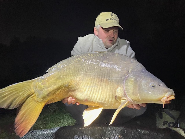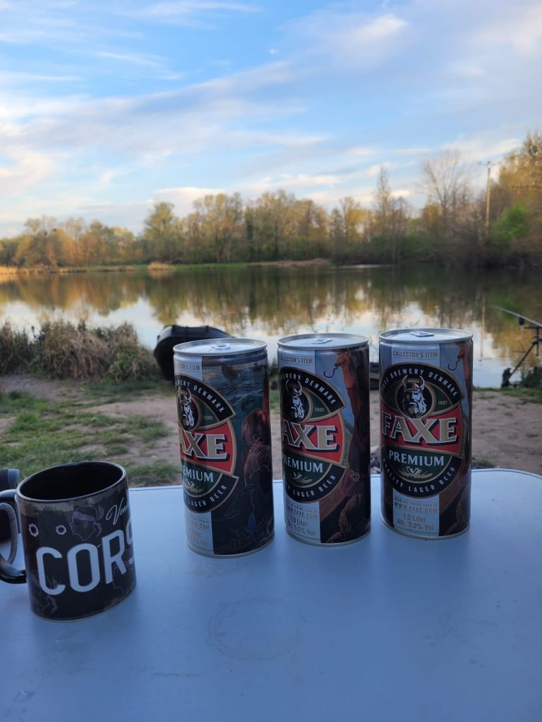 Gegen 17.30 Uhr sollen die Ruten eingeholt werden, um sie bereits für die Nacht zu bestücken und neu auszufahren, aber sowohl Christians Ruten als auch meine Rute hängen fest und können nur mit dem Boot befreit werden, wobei meine Montage komplett abreist und verloren geht. Das nervt mich, zum einen weil alles neu gebunden werden muss, und zum anderen, dass man sich bei diesem Gewässer einfach merken muss, dass wenn man mehrere Anfasser hatte und sich dann eine gewisse Zeit nichts mehr tut, man die Rute einfach neu legen soll! Und so lagen unsere Ruten eben den ganzen Mittag tot im Holz. Naja, 19 Uhr ist dann alles erledigt und der letzte Feederangler ist abgereist. Die Pizzabestellung wird aufgegeben, und einem Jungangler am anderen Ufer wird noch mit dem Boot geholfen, denn seine Montage ist an einem Ast im Wasser hängen geblieben. 20 Uhr kann gespeist werden, und der Tauschbasar floriert, denn Pizzastücke gegenseitig tauschen hat sich mittlerweile voll etabliert. Um 21 Uhr haben Marian und Christian dann noch eine Überraschung: 3 Dosen Faxe-Bier mit jeweils 1 Liter Inhalt, „uff“, aber es nützt nix, das edle Getränk will geschmeckt und geleert werden. 22.30 Uhr und durch diverseste ChatGPT-Auskünfte erhellt begeben wir uns dann in die letzte Nacht. Es wird etwas kälter und die Decke muss dem Schlafsack weichen. Um ca. 23 Uhr klopft es an meinen Bus und Christian bittet um Hilfe. Als ich endlich draußen bin steht er da mit gebogener Rute, und im Schein der Kopflampe erscheint ein Spiegler im Wasser der bestimmt kein kleiner ist. Sicher gleitet er wenig später in den Kescher und ich merke es schon als ich Ihn auf die Abhakmatte hebe, das ist ein Ü15 kg. Marian wird auch geweckt und gemeinsam lichten wir den Fisch in Christians Händen ab. Die Waage bestätigt dann die Vermutung, satte 16 kg! Christian fährt die Rute mit dem Boot noch einmal neu aus und dann geht’s wieder ab in die Betten. Die Nacht verläuft mit vielen Piepsern und Fehlbissen, aber Marian kann doch noch einen Kleinen im Freiwasser fangen.